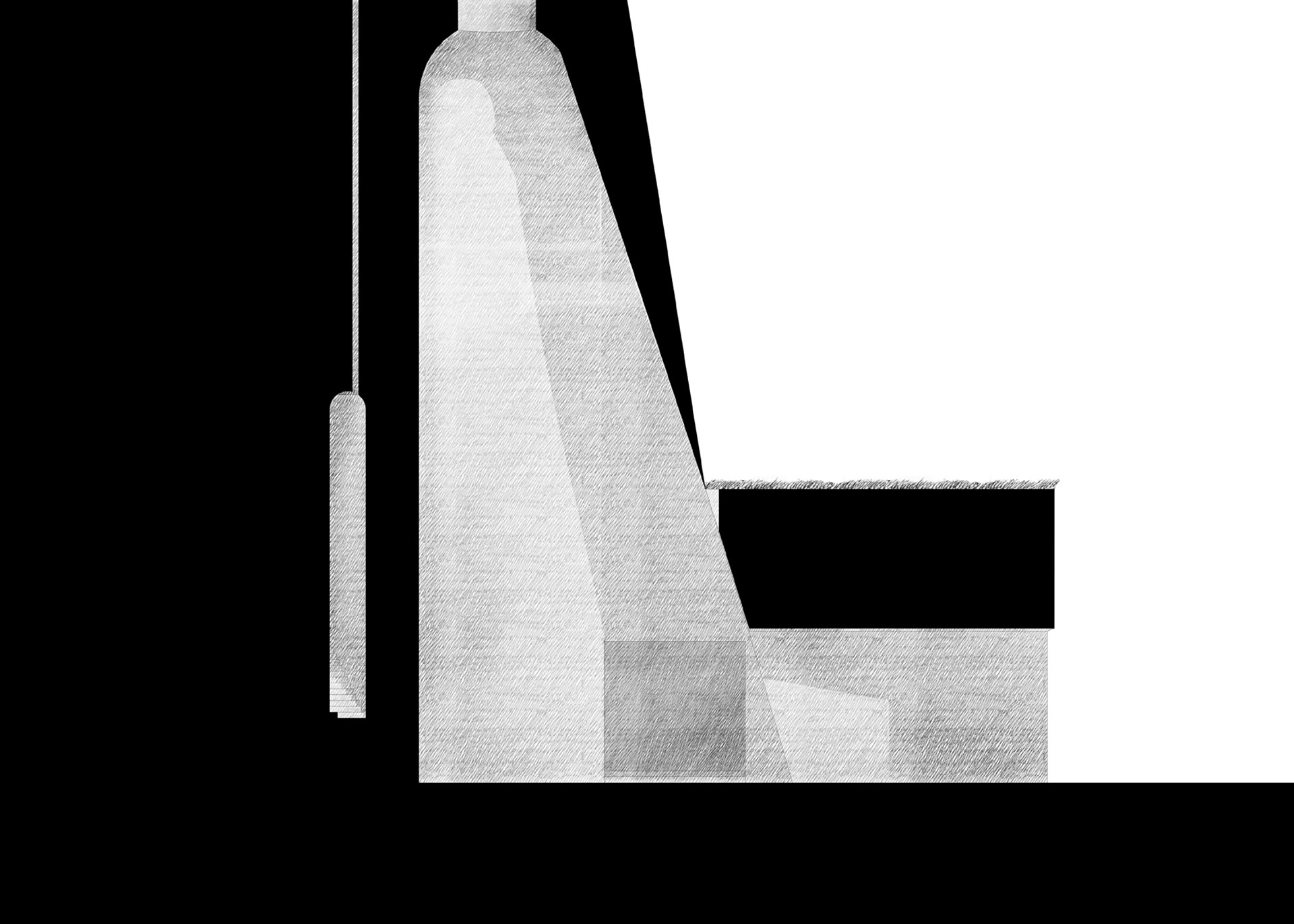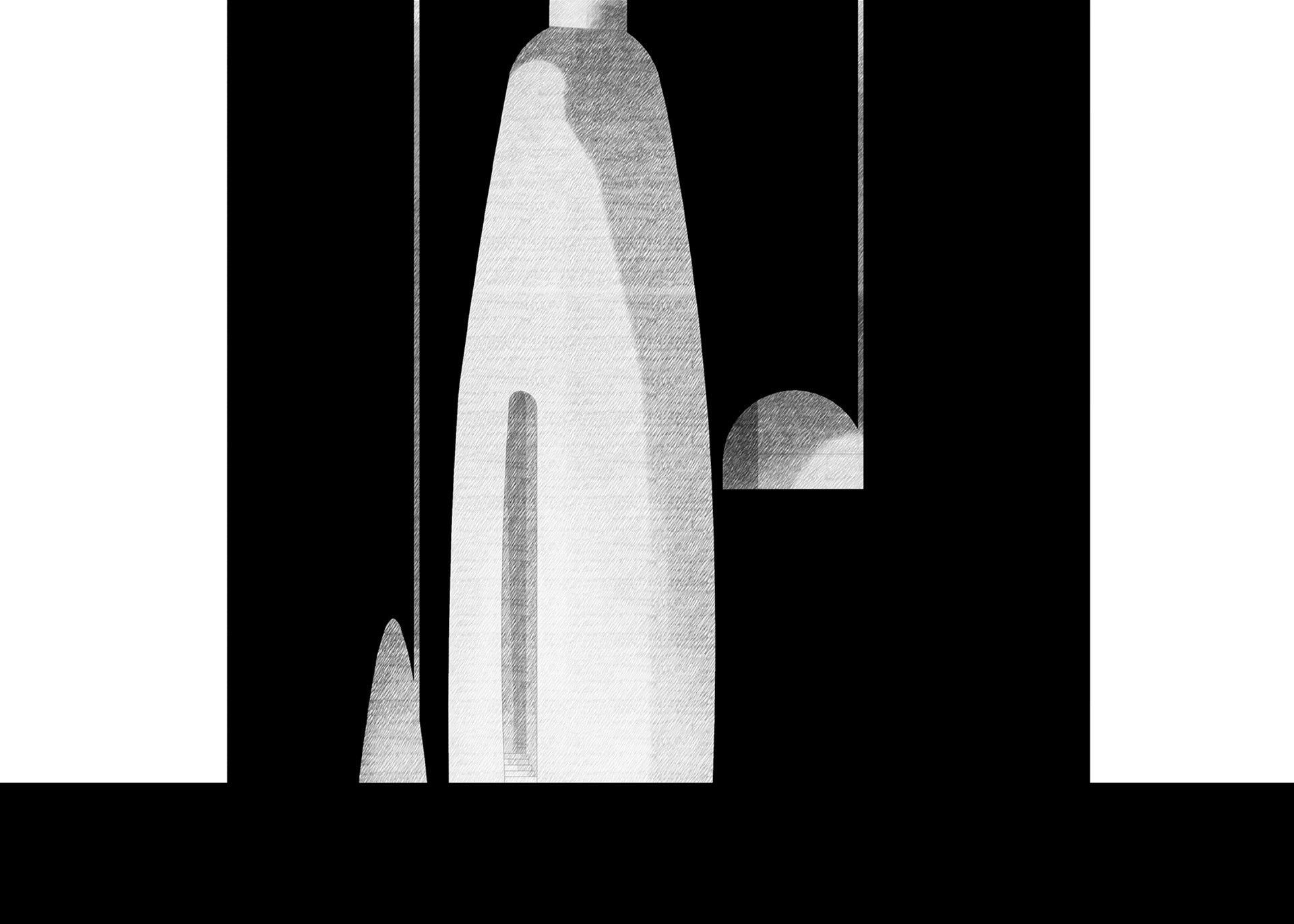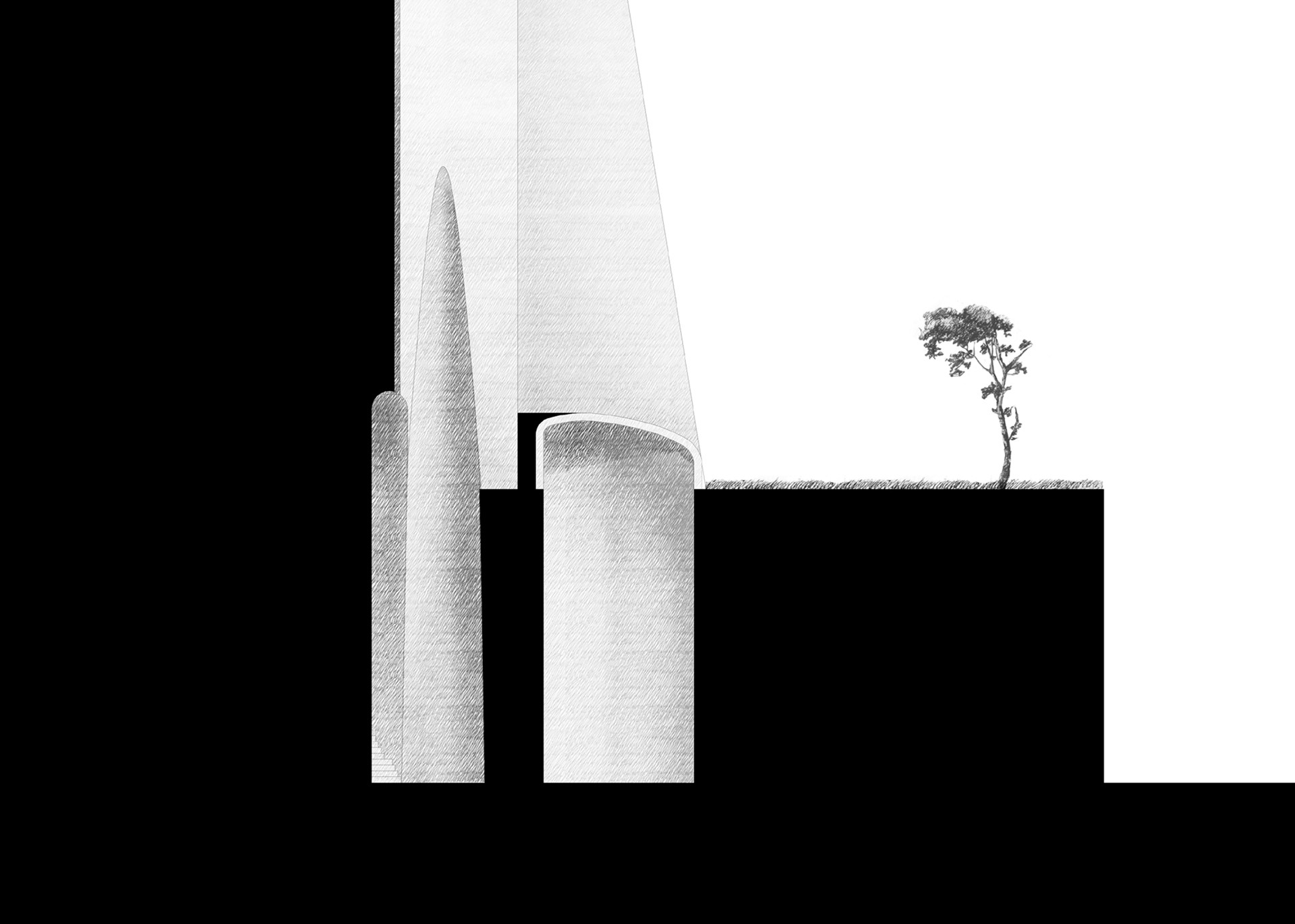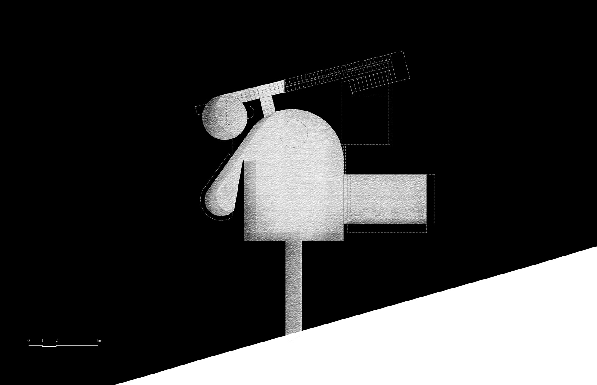 When you walk in Lisbon and pass by the old wall with garage gates you might not expect that this wall can hide a villa. Modest outside and rich in the interior, excavated in landscape and full of light. A narrow tunnel of the entrance leads to the main tall space with an oculus in the dome. The room for eating is subtracted from the main space; it is a big opening slightly above the main room and it acts as a stage. The library is the most sacral space for concentration and it reminds the church’s apsida, light and peaceful. The bathroom is a tall cone space where the light falls like water. The last space is achievable only for masters, it is a bedroom. This is the only room which has a huge window and access to the garden with the view of the whole city lying below.