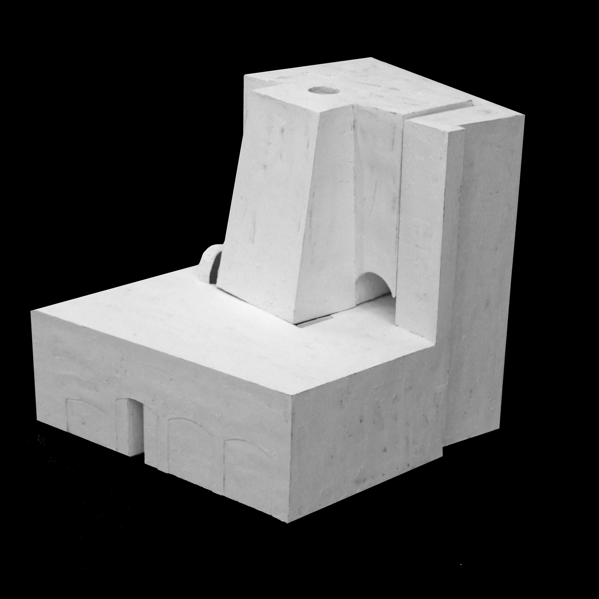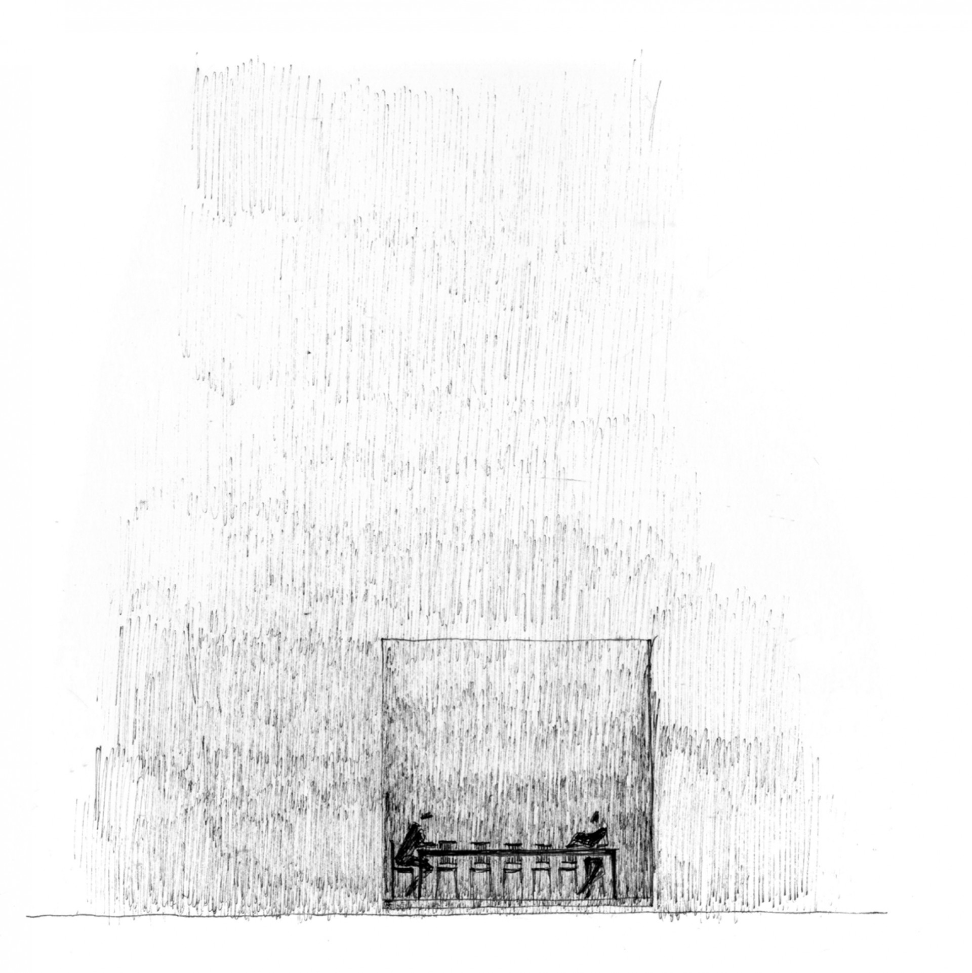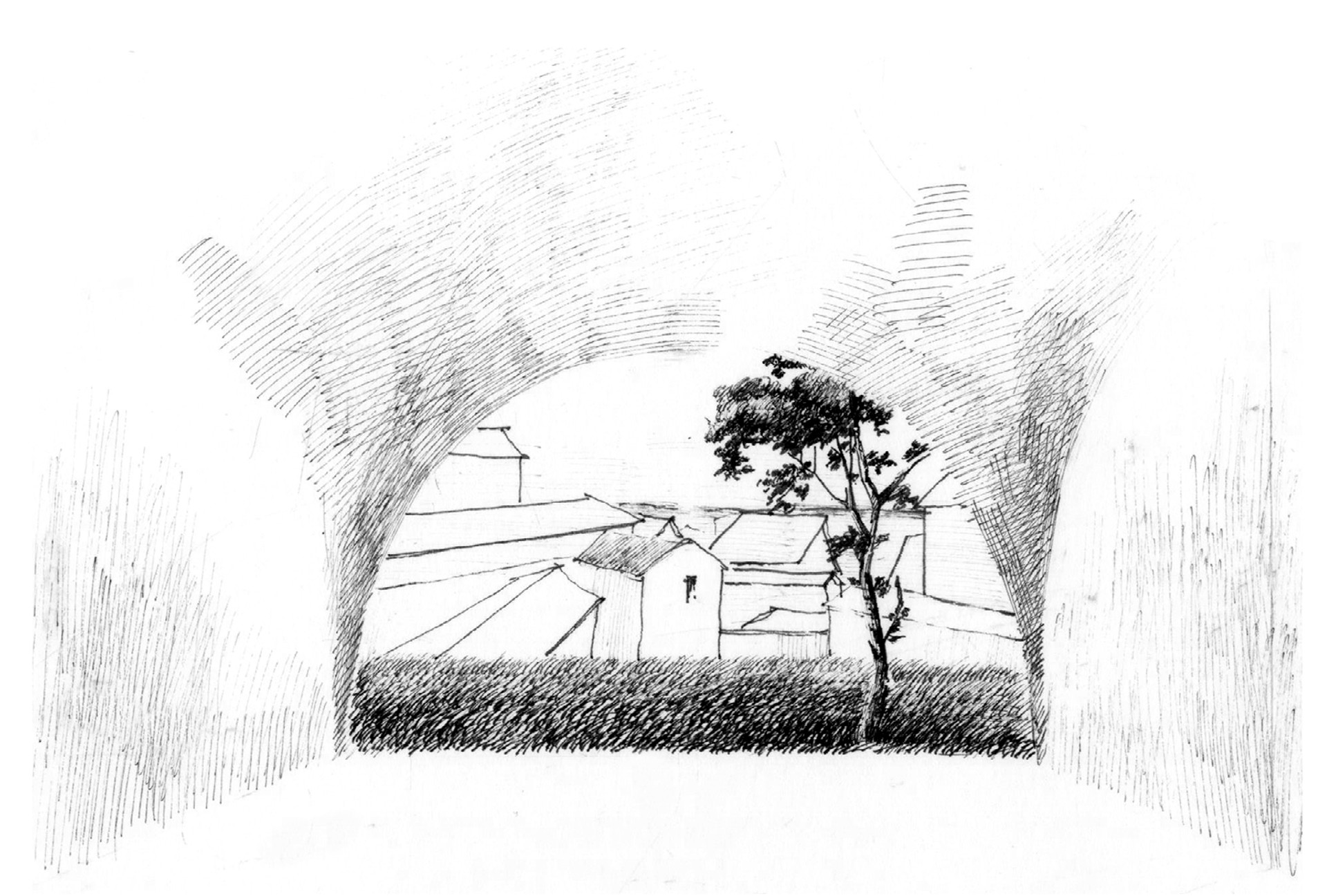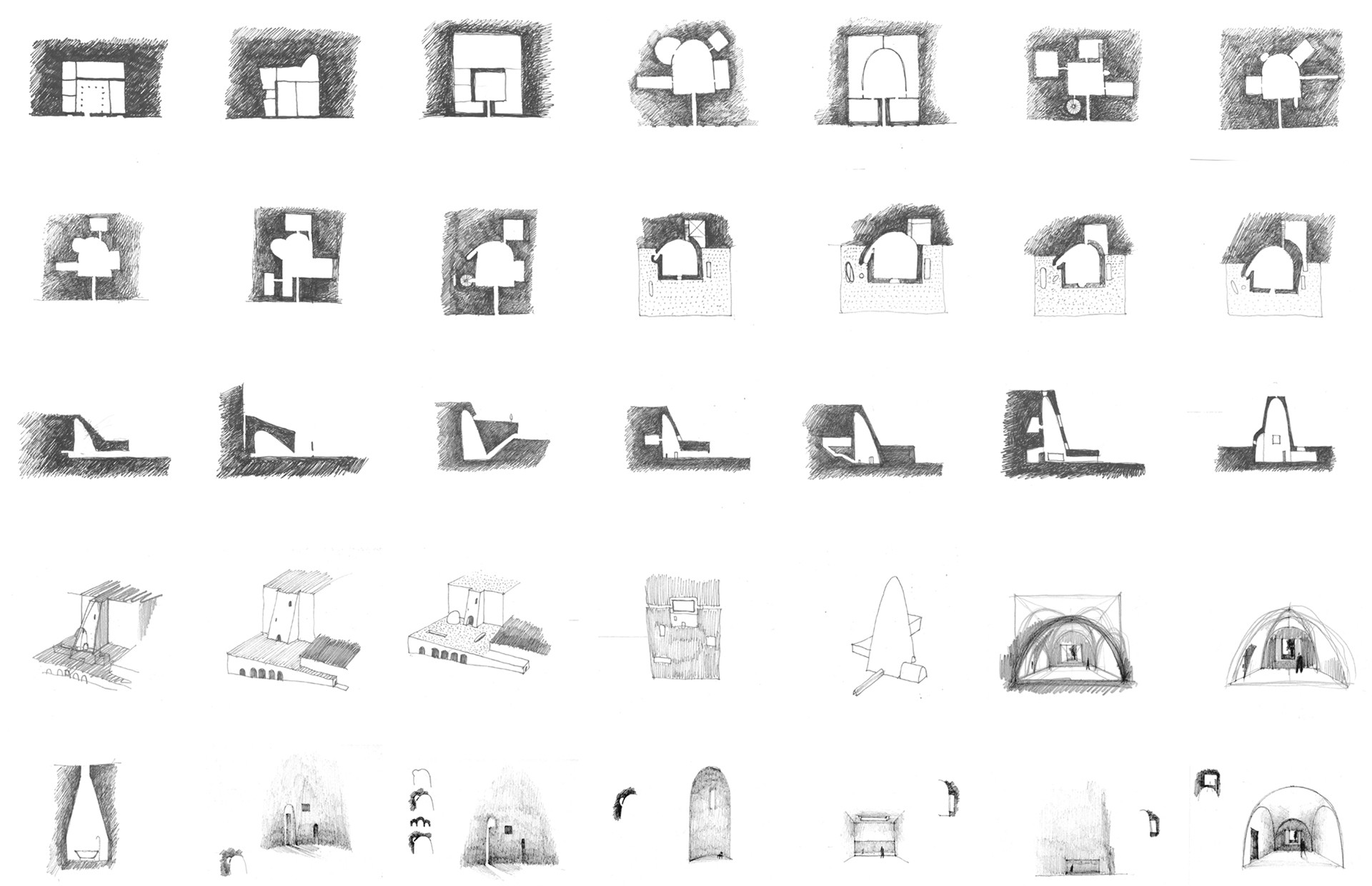 When you walk in Lisbon and pass by the old wall with garage gates you might not expect that this wall can hide a villa. Modest outside and rich in the interior, excavated in landscape and full of light. A narrow tunnel of the entrance leads to the main tall space with an oculus in the dome. The room for eating is subtracted from the main space; it is a big opening slightly above the main room and it acts as a stage. The library is the most sacral space for concentration and it reminds the church’s apsida, light and peaceful. The bathroom is a tall cone space where the light falls like water. The last space is achievable only for masters, it is a bedroom. This is the only room which has a huge window and access to the garden with the view of the whole city lying below.