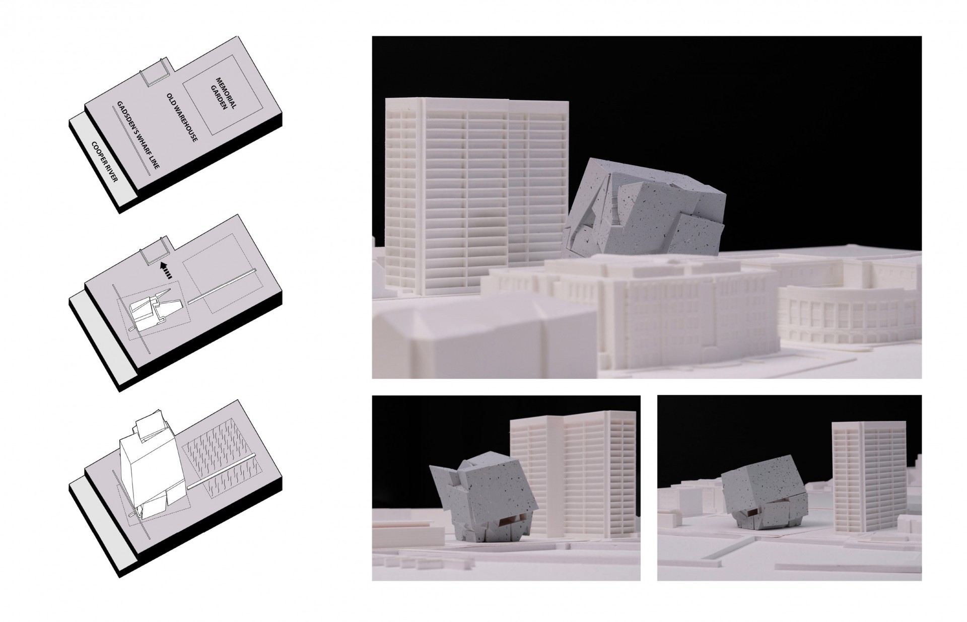 The project begins by working simultaneously on creative form/material studies and analytic diagraming of Aldo Rossi’s Monument of the Resistance in Cuneo (1962) and Giuseppe Terragni ‘s “A Small, Rationalist Monument (1934). In the initial design process, the “Gadsden’s Wharf” line plays a crucial role in the adaptation of the formal research.